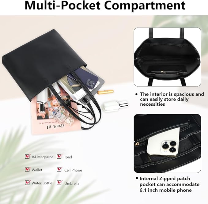 - 👜【Gran capacidad】Un bolso de mano para mujer tiene un compartimento principal y un bolsillo interior con cremallera. Lo suficientemente espacioso como para almacenar fácilmente revistas A4, libros, iPad, billetera, paraguas, botella de agua, teléfono móvil, pañuelos, cosméticos y otras necesidades diarias.